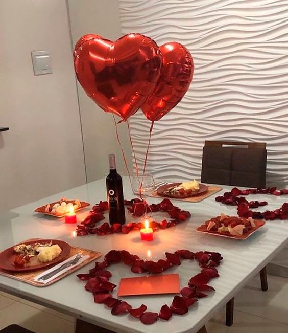 Plan to design Valentine theme invitation cards, use heart-shaped balloons, romantic candles, love arch, romantic seating arrangement, rose bouquet, and heart-shaped ring box.